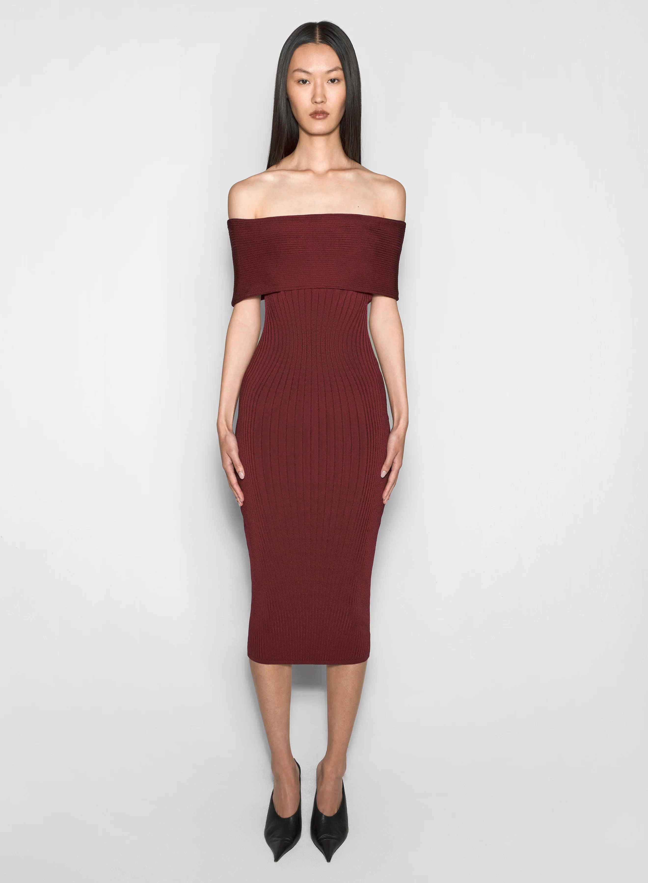 off-shoulder sculpting knit dress—